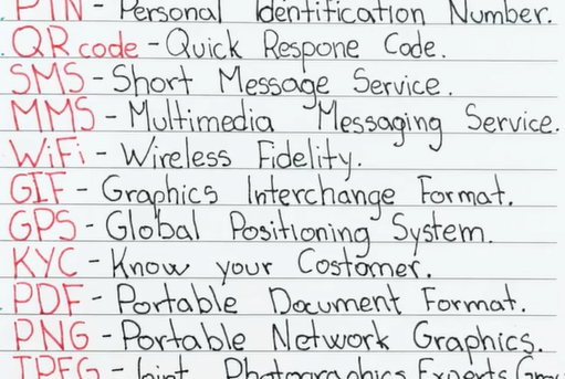 הכרת ראשי התיבות האלה באנגלית OTP PIN QR code SMS MMS WiFi GIF GPS KYC PDF PNG JPEG URL WWW PAN המשך…